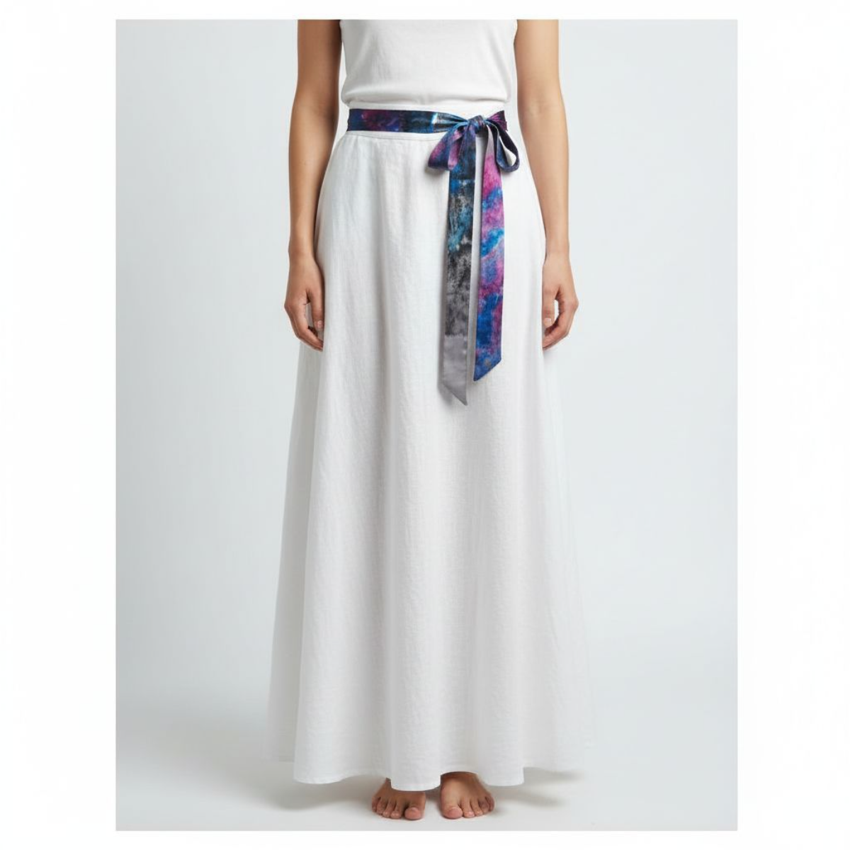 You can wear it in many ways — tied around your waist, loosely draped at the neck, or even wrapped around your hair or bag. Each piece is one of a kind, carrying small traces of the brush and the moment it was made.