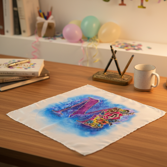 - Technique: Hand-painted with silk dyes + resist outlining