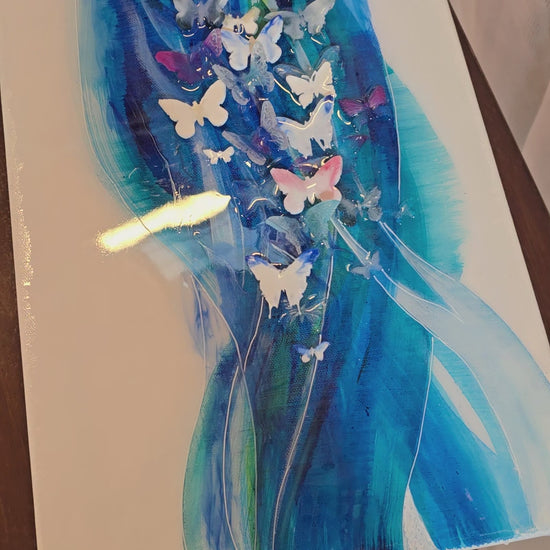 In this mixed media painting with acrylic and resin, I created a dreamy azure path where 3D butterflies seem to come alive, fluttering just above the surface. Each butterfly is carefully crafted, with wings that cast playful shadows on the textured background. The resin adds a luminous finish, making the colors feel deep and glowing, almost as if the painting itself is breathing.