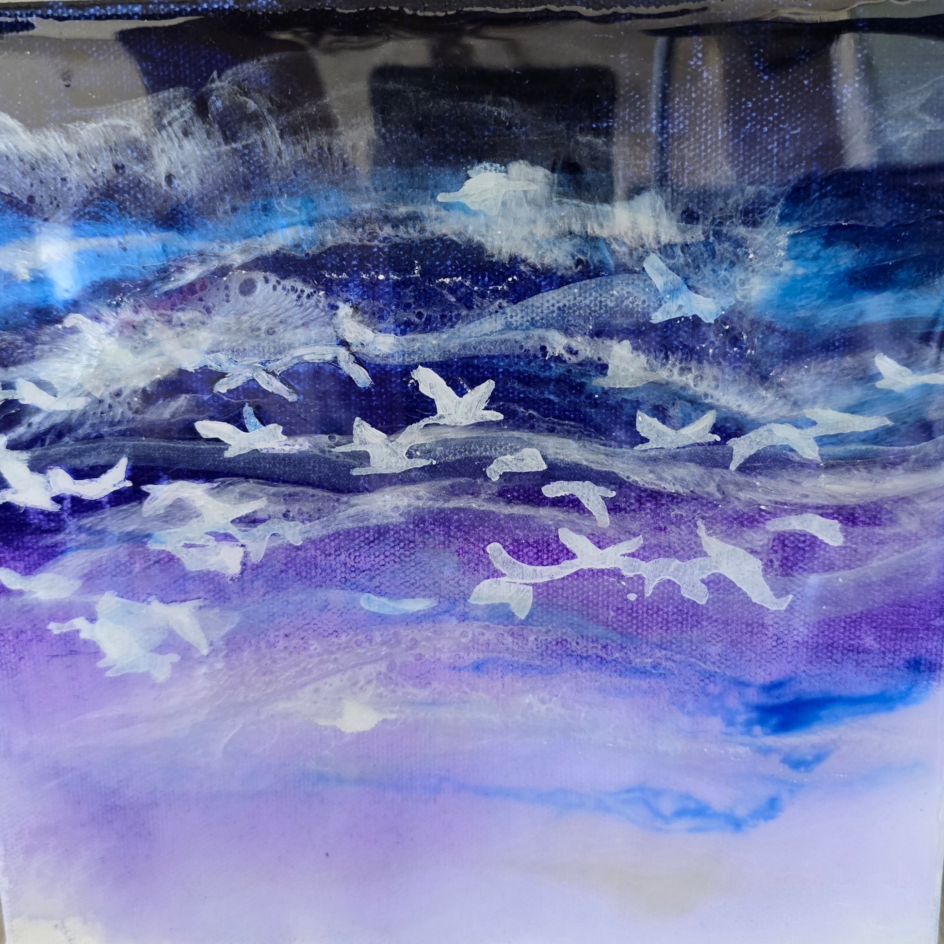 This painting is inspired by the quiet beauty of the forest. I used layers of acrylic and watercolor to build soft textures and colors—greens, blues, and orange—that remind me of walking among trees and light.