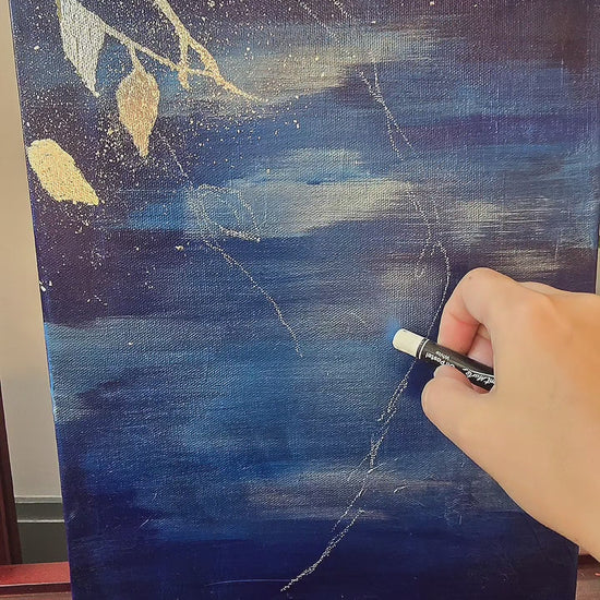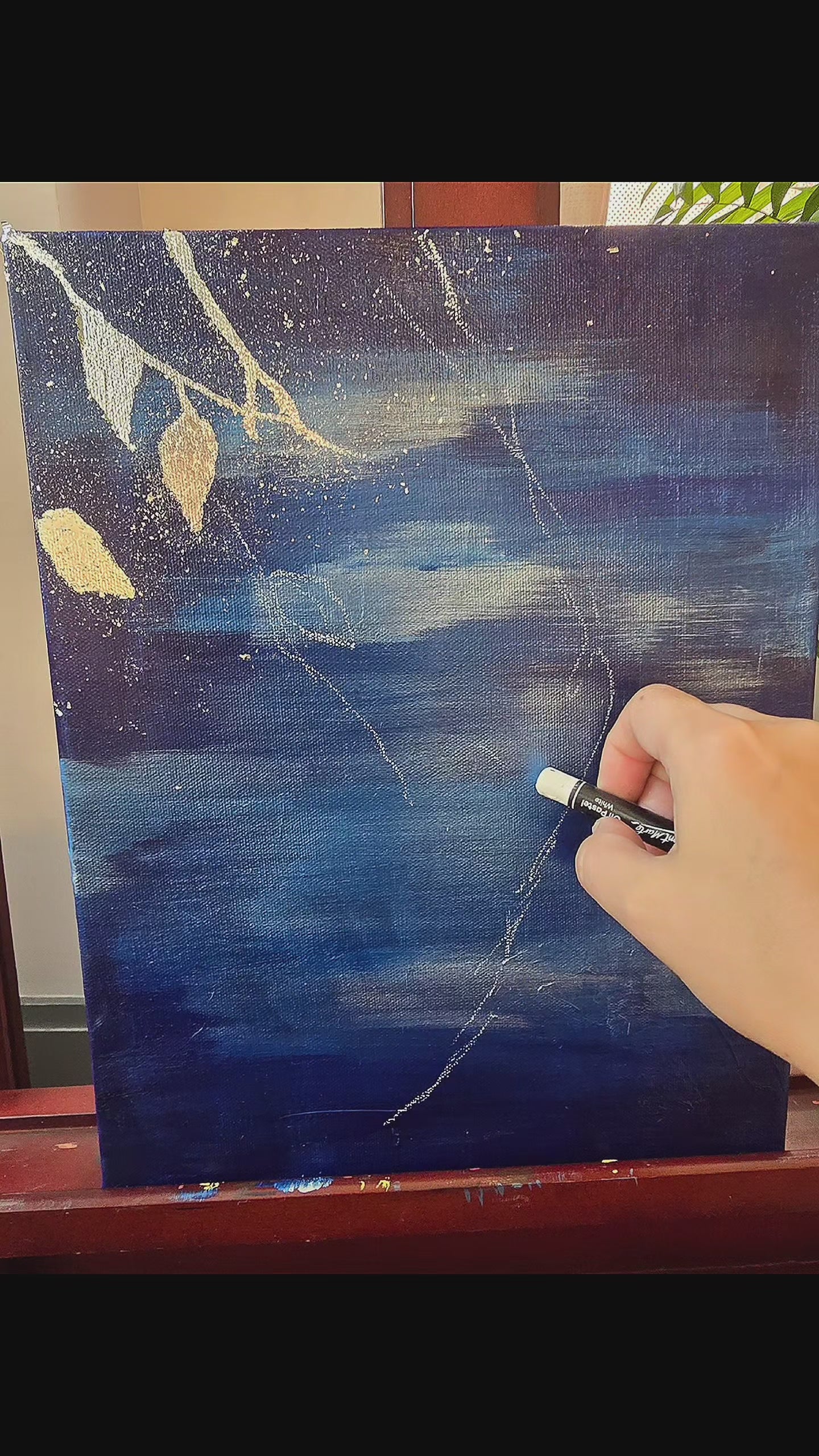 This painting captures the gentle flow of silver leaves drifting across a deep blue sky. I created it with layers of acrylic paint as the base, added shimmering silver foil for the leaves, and finished it with a glossy resin coat that makes the colors and textures come alive.